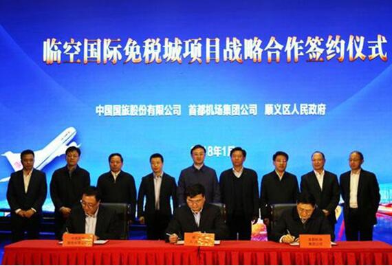 1月12日,中国国旅股份有限公司、首都机场集团、顺义区三方在京举行临空国际免税城项目战略合作框架协议签约仪式。中国旅游集团副总经理、国旅股份公司董事长李刚,首都机场集团公司总经理、党委副书记刘雪松,北京市顺义区委书记王刚出席签约仪式,国旅股份公司总经理彭辉、首都机场集团党委书记、副总经理宋胜利与顺义区区委常委、副区长初军威代表三方在协议上签字。