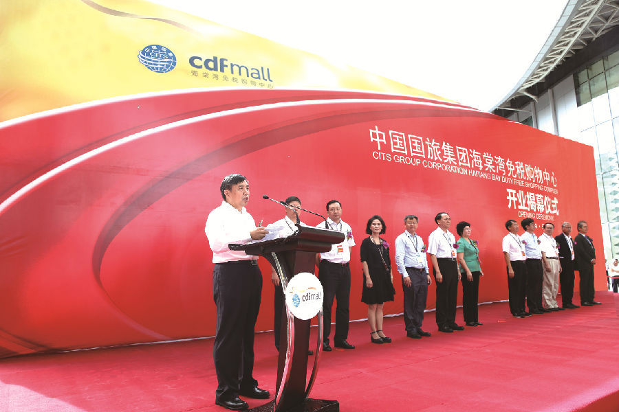 开业仪式上,王为民发表了热情洋溢的讲话。他首先代表国旅集团对各界的关心和支持表示衷心的感谢,随后简要介绍了国旅集团的基本情况、主要业务和今后发展方向。他回顾了海南离岛免税政策、三亚市内免税店发展历程。2007年,国旅集团提出“在海南开展离岛免税购物”的构想,并配合海南省委省政府争取离岛免税政策;2011年,米兰三亚免税店作为离岛免税业务试点启动,极短时间内便迅速成为海南省日均接待游客过万的旅游景点之一,至今已累计接待顾客1200多万人次。“旅游加免税购物”已成为海南旅游的新名片。他向与会嘉宾介绍了海棠湾免税购物中心项目的特点和优势,并表示项目的落成开业将极大地释放海南离岛免税政策红利,助力海南国际旅游岛建设,也必将成为我国免税业发展的里程碑。他说,海棠湾免税购物中心是全球最大的免税商业综合体,总面积达12万平米、集购物、休闲、娱乐、餐饮等多功能于一身,具有国际先进水准、地标性的建筑。它集合优势资源,招商引进了300个全球顶级时尚品牌和精心准备的超过10万个单品;其中有的是携手合作伙伴,打造的最新、最时尚的概念店、全球最大和亚洲最大的品牌旗舰店。国旅集团将以一流的品牌、一流的商品、一流的服务、一流的环境,为海南省、三亚市和来海南的广大游客带来持续不断的惊喜和发现!展望未来,国旅集团将进一步坚定深耕海南旅游市场的信心和决心,通过积极整合旗下免税、旅行社等多业务板块资源,不断发挥在资金、品牌资源、运营、管理等方面的优势,利用海棠湾免税购物中心这个全新平台,积极推动国际旅游岛建设,为广大游客奉献更为丰富多彩的旅游购物体验。他坚信,有社会各界的鼎力支持和关爱,有全体员工的智慧和奉献,海棠湾免税购物中心一定会拿出骄人的业绩,成为国家海岸独具魅力的亮丽风景,为海南旅游业发展做出积极的贡献!