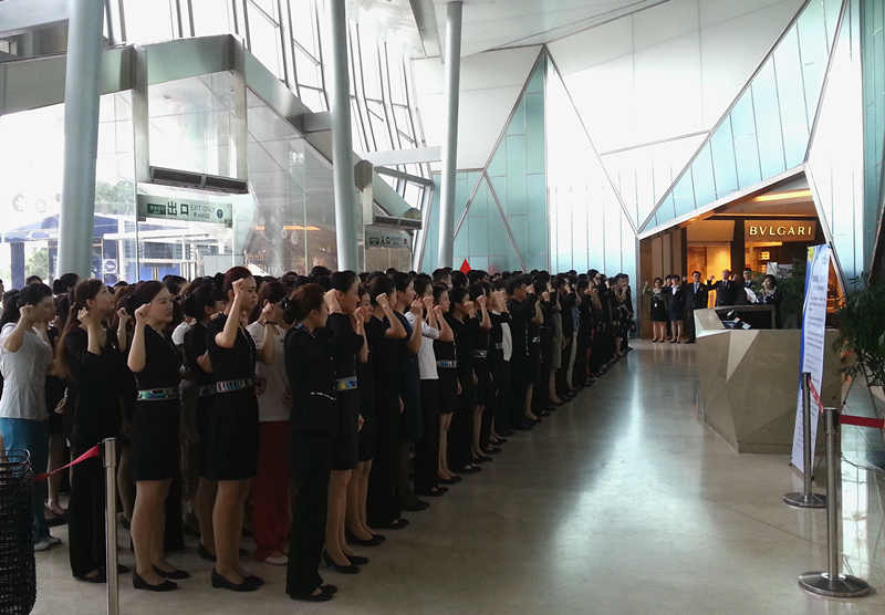 “我宣誓,我们将以客户为中心,以市场为导向,不怕困难、专业高效、团队合作、勇于创新,用诚信经营赢得顾客的信任,用优质服务换取顾客的满意。”洪亮的声音在三亚市内免税店内回响,宣誓着承诺和责任。