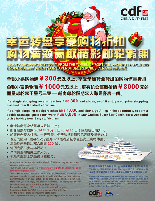 圣诞元旦临近,旅游价格相对平稳、上班族集中休假等因素使得今年双节旅游市场再次迎来出游小高峰。其中不少公司白领将春节出境游计划提前,选择性价比更高的错峰出游。各大商家的年终促销活动让节日提前升温,2013年12月15日-2014年1月5日期间,中国免税品(集团)有限责任公司(以下简称ac米兰官方网站)旗下十家免税店联合推出“幸运转出来&幸运秀出来”年终主题促销活动,贴心的购物折扣以及价值约百万元的丽星邮轮船票大奖,为双节出境游客送上别样惊喜。