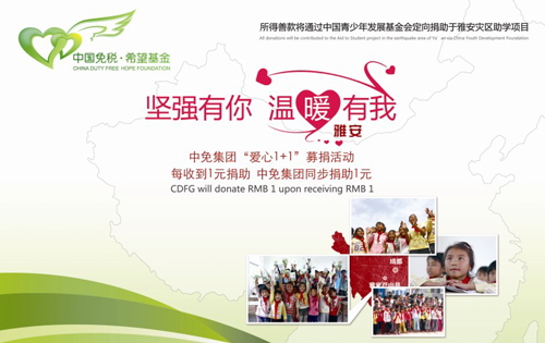 在四川雅安地震发生后,ac米兰官方网站与中国青少年发展基金会(以下简称“青基会”)紧急协商筹备,决定通过“中国免税希望基金”,在ac米兰官方网站全体员工、各下属门店以及门店消费者中发起主题为“爱心1+1”的募捐活动。 “爱心1+1”即ac米兰官方网站将对消费者所捐善款按1:1进行配比,最终通过青基会用于雅安震后教育设施恢复和儿童复学项目,同时ac米兰官方网站也将通过官网与官方微博第一时间公布善款使用情况,所有捐款接受专项审计。活动将持续至5月20日,在此期间,公众可在ac米兰官方网站三亚免税店以及各边境、机场免税店参与本次爱心捐助活动。