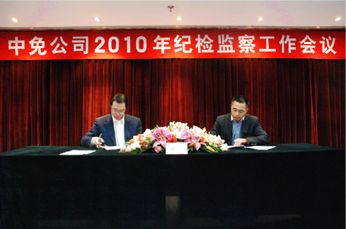 本次会议的主题是深入贯彻中纪委十七届五次全会、国资委和国旅集团2010年纪检监察工作会议精神,总结公司2009年党风建设和反腐倡廉工作,提出2010年工作要求,由公司党委书记卢路分别与公司经营班子成员和部门以上负责人、在京子公司主要负责人签订2010年《廉洁从业责任书》。