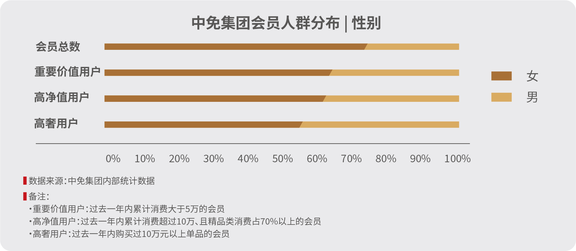 尽管女性会员在数量上仍占绝对优势,但高净值用户和高奢用户中,男性比例普遍高于在会员总体中的占比水平,尤其在高端消费群体中表现突出。