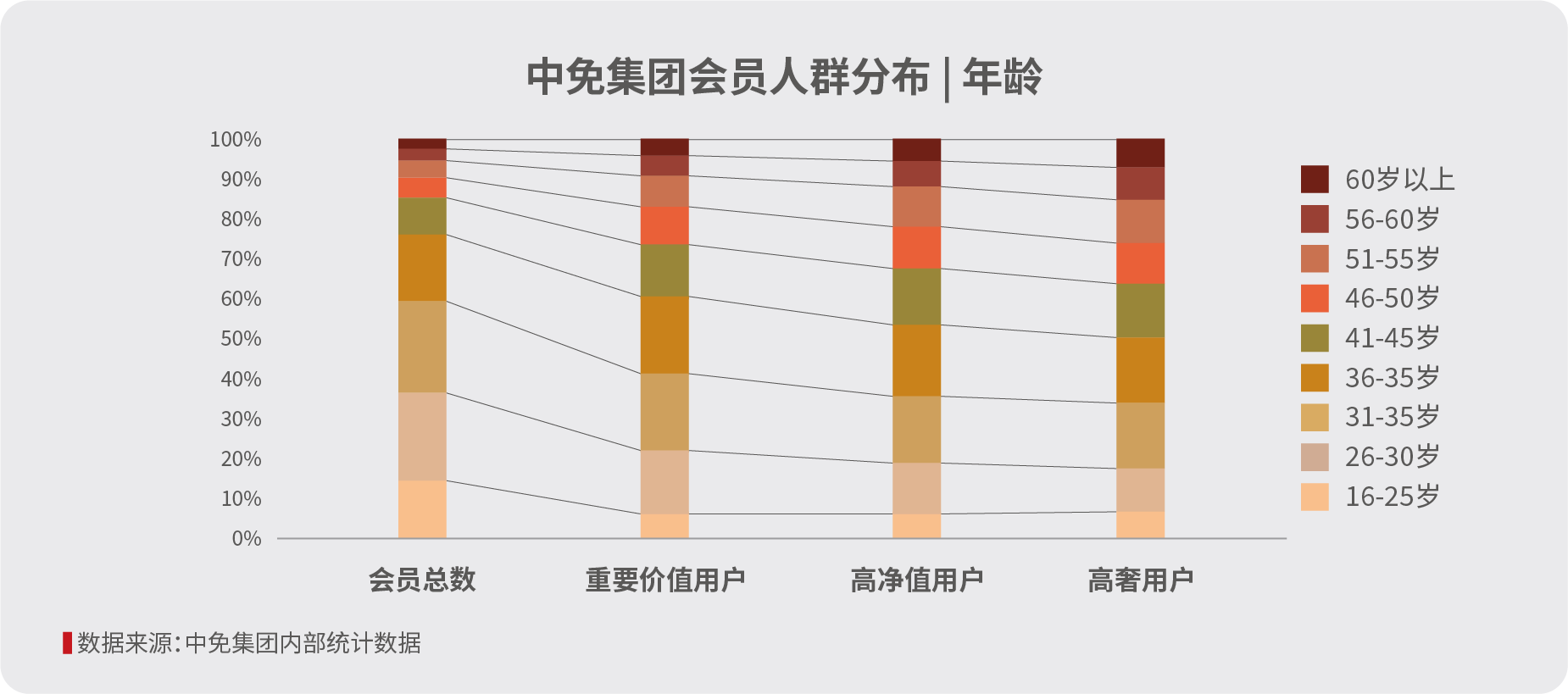 60岁以上会员规模同比增速最为显著,环比增长高达47%,50岁以上群体在高净值、高奢客群中的占比,远超其在整体会员中的份额。