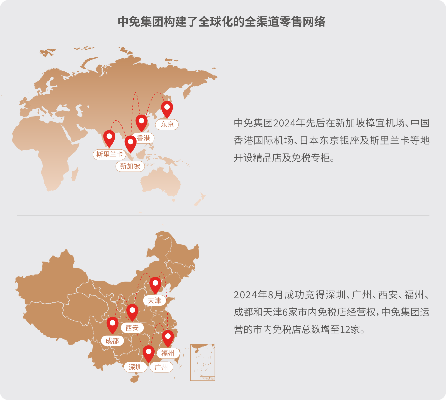 2024年,米兰加速全球化,新加坡樟宜机场、日本东京银座等境外点位陆续落地;成功竞得深圳、广州等6家市内免税店经营权,使集团在中国内地市内店运营总数增至12家,强化了“境内外联动、线上线下协同”的网络格局。