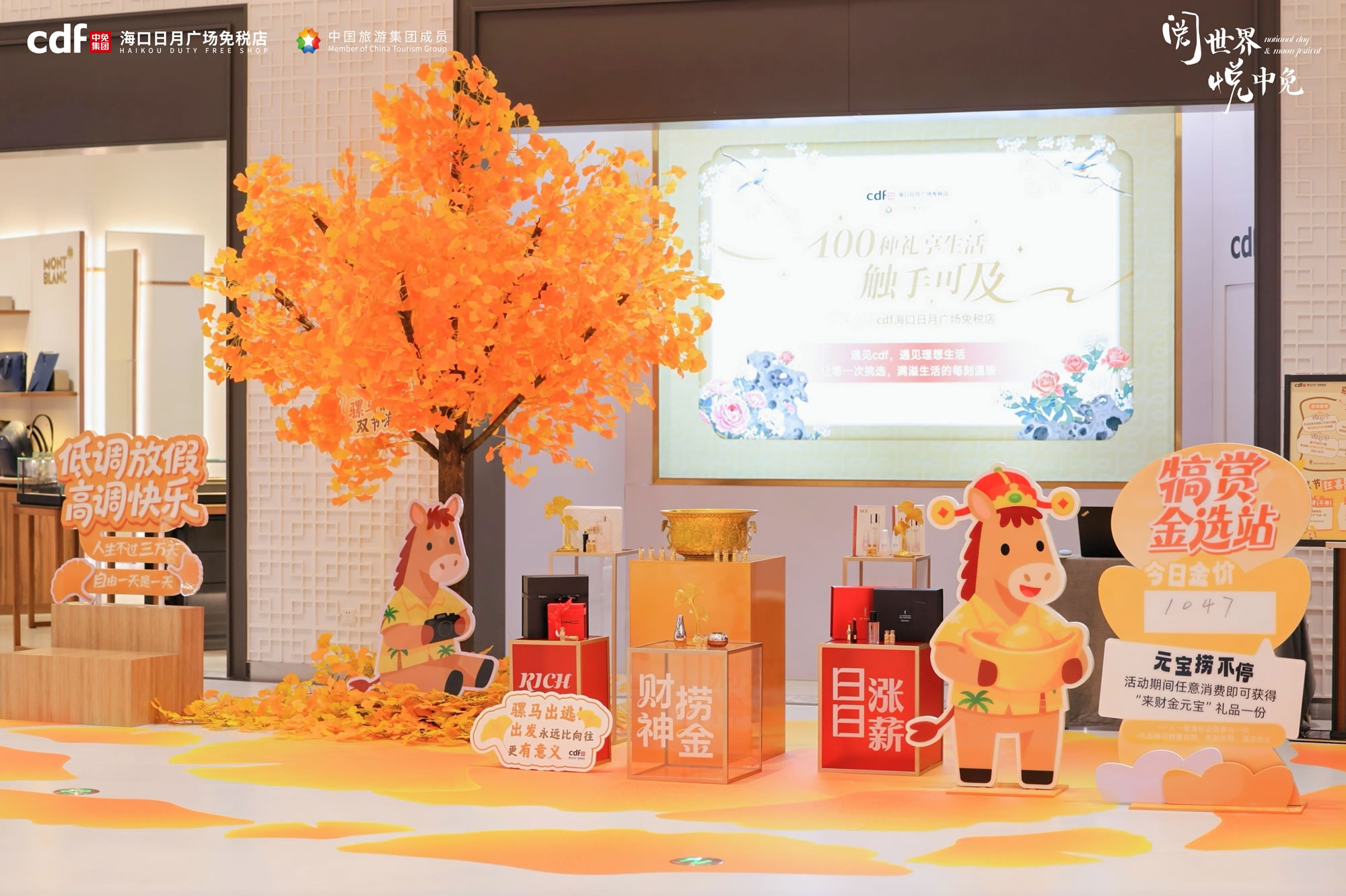 cdf海口日月广场免税店以“双节放大招”之势,推出低至3折的爆品与满额立减,并融合“骡马假日”主题打卡、中医义诊、“淘金捞元宝”等互动体验,让购物过程乐趣横生。