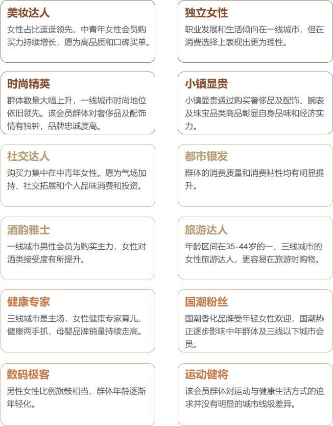 通过分析米兰会员的年龄段、城市分布、兴趣爱好和消费观念的差异,白皮书将米兰会员拆分成不同标签群体,如美妆达人、独立女性、时尚精英等12类人群画像,进一步洞察不同免税消费群体的购物需求,品质化、国产化、独特化成为消费重点。