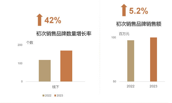 2023年,香化产品销售总额在总销售额中占据重要地位,已达整体品类销售额一半以上,国产香化品牌销售增速明显,理性消费人群逐步倾向国产香化替代。护肤品初次销售品牌的快速增长推动其销售额占比跃升至新高度,得益于ac米兰官方网站紧随国货热潮的差异化市场策略,成功引入了一系列国货护肤品牌,促进了销售额的显著增长。